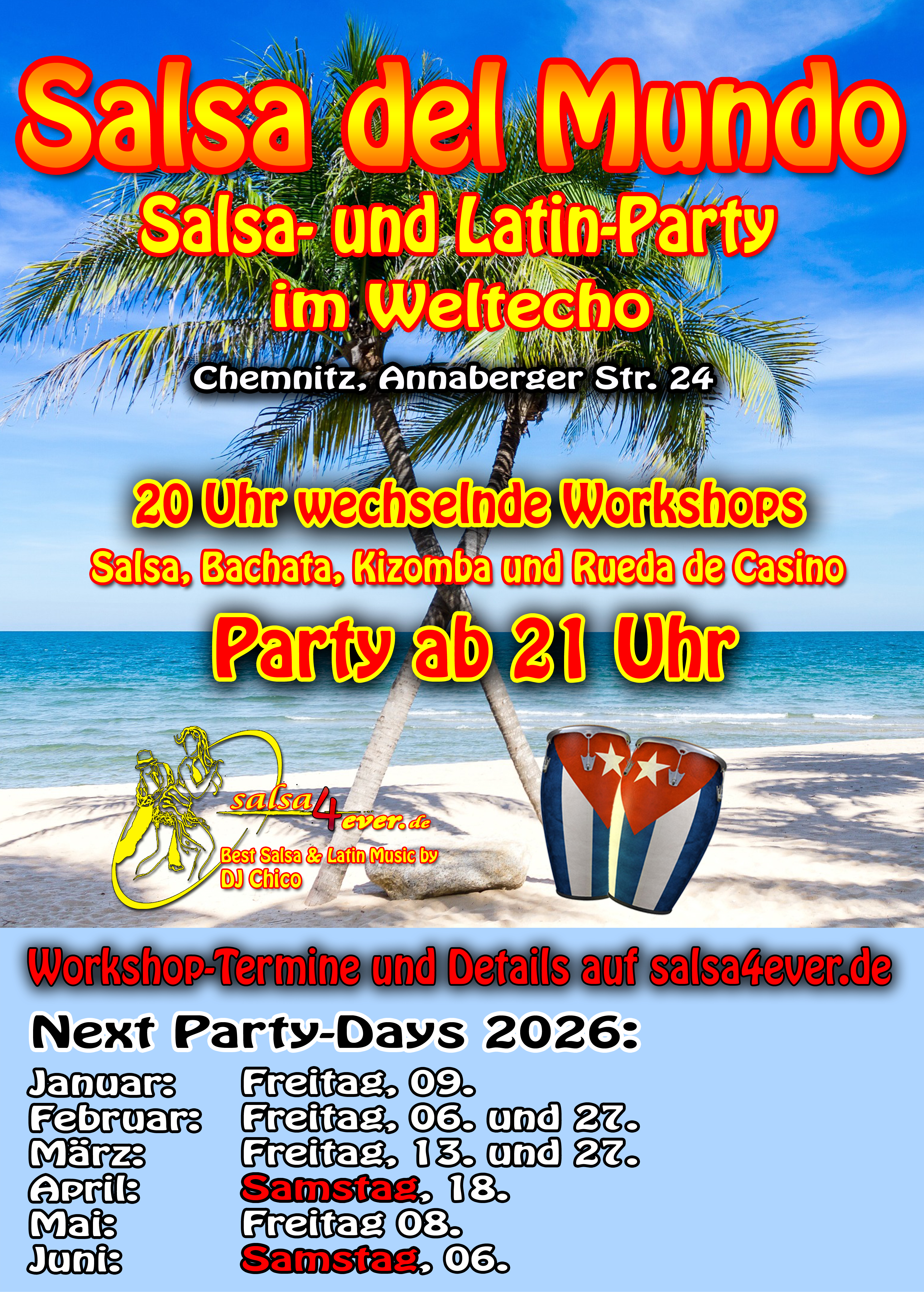 X-ALT-DESC;FMTTYPE=text/html:<p><img src="images/Kalender/Partys/Party-WE-2026%201.%20Halbjahr.jpg" width="379" height="530" /></p>\N<h2><strong>Salsa del Mundo</strong></h2>\N<p>21 Uhr Salsa del Mundo</p>\N<p>Salsa &amp; Latin-Party mit einem Mix aus Salsa, Bachata, Kizomba und mehr. Best Salsa &amp; Latin Music by DJ Chico</p>\N<p>Infos zu den Tanzkursen hier: <a href="index.php/tanzkurse-und-workshops">Tanzkurse</a></p>